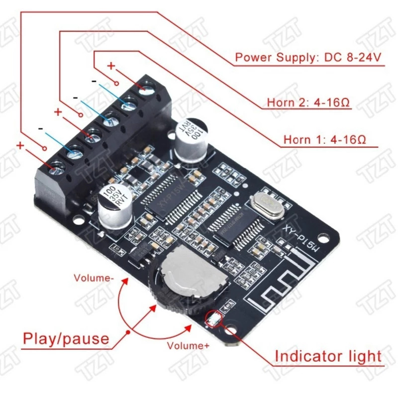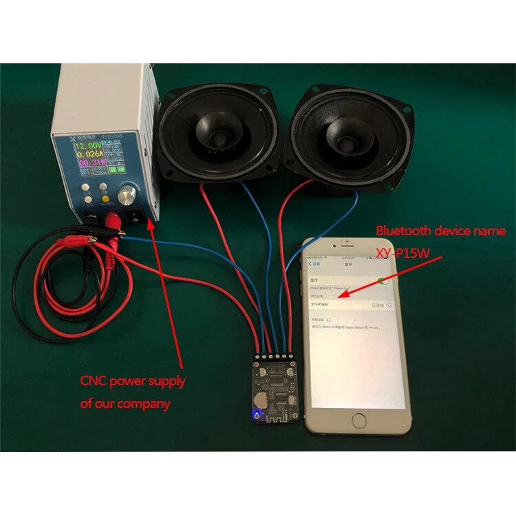 Cung cấp nguồn điện cho mô-đun, đèn LED màu xanh lam bật và thiết bị chuyển sang chế độ Bluetooth; Chờ ghép nối sau khi phát âm thanh; Bật Bluetooth của điện thoại, tìm “XY-P15W”; Nhấn vào “XY-P15W”, điện thoại sẽ kết nối với bảng mạch. Khi kết nối thành công sẽ có một giai điệu âm thanh; Sau đó, bạn có thể phát nhạc. Bảng mạch khuếch đại công suất sẽ chuẩn bị cho lần ghép nối tiếp theo sau khi Bluetooth bị ngắt kết nối.